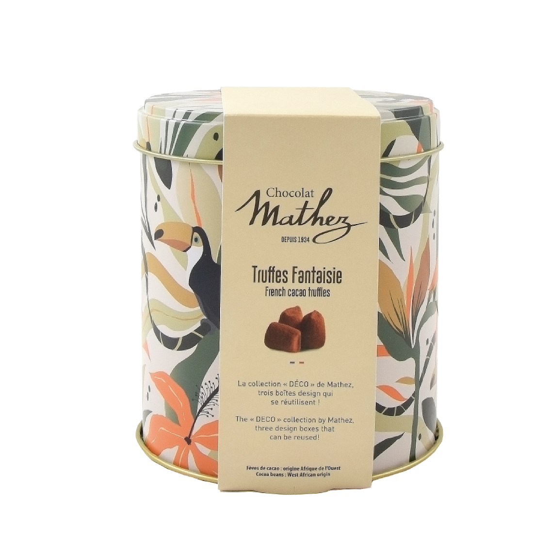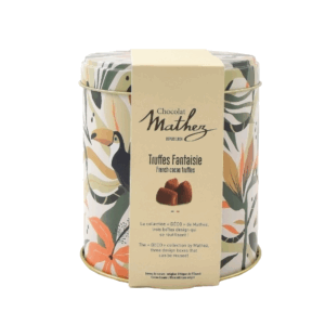 Des truffes tendres et fondantes avec un bon goût de cacao dans une magnifique boite métallique dorée, proposée par la maison Mathez, chocolatier français depuis 1934.